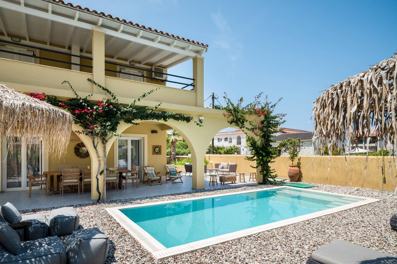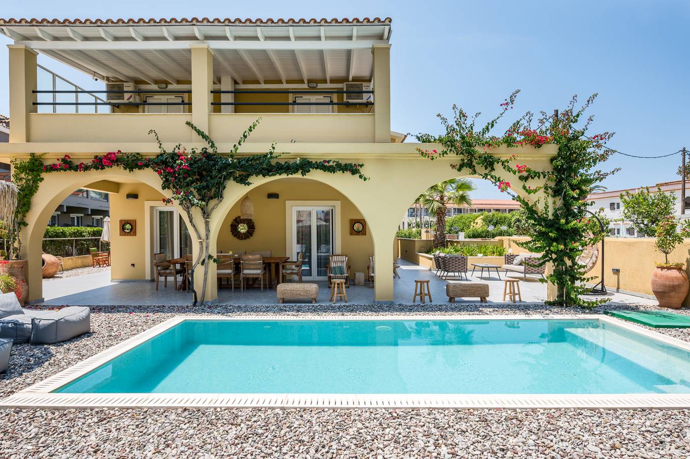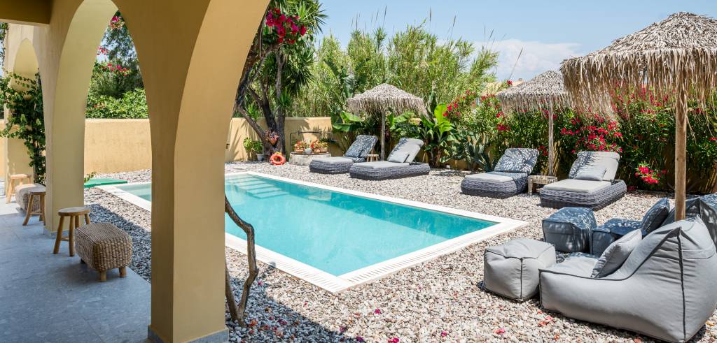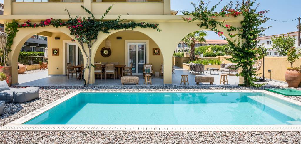 Entdecken Sie die ultimative Mischung aus Luxus, Privatsphäre und Komfort in unserer Private Pool Villa im Acharavi Beach Hotel. Dieser exklusive Rückzugsort bietet Platz für bis zu sechs Erwachsene und ein Kind und verfügt über drei elegant eingerichtete Schlafzimmer, die jeweils mit einem Mini-Kühlschrank und einem Flachbildfernseher ausgestattet sind. Mit drei modernen Badezimmern, einer voll ausgestatteten Küche mit Essbereich und einem geräumigen Wohnbereich sorgt die Villa für einen reibungslosen und entspannten Aufenthalt. Genießen Sie den privaten Swimmingpool, den Grillplatz oder die möblierte Terrasse oder den Balkon nur wenige Schritte vom Meer entfernt. Jedes Detail wurde für Ihren Komfort und Ihre Bequemlichkeit entworfen, was diese Villa zum perfekten Zufluchtsort für Familien oder Gruppen macht, die raffinierte Gastfreundschaft in Meeresnähe suchen.