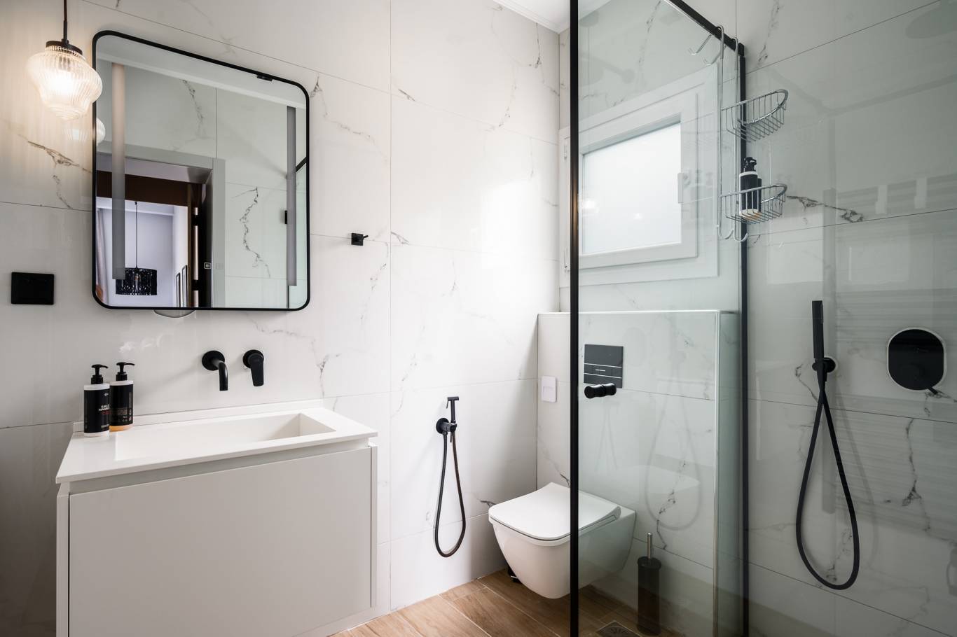 Drei Bäder mit Bademänteln, Hausschuhen, Vergrößerungsspiegeln und hochwertigen Toilettenartikeln